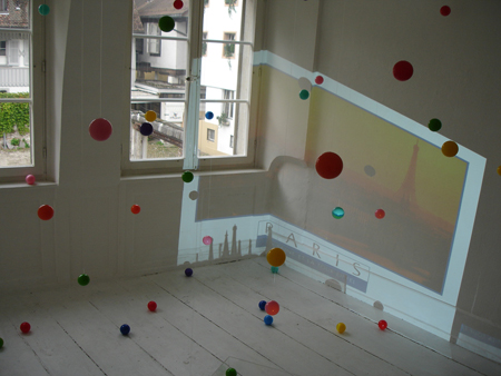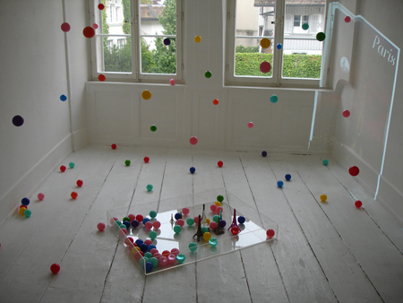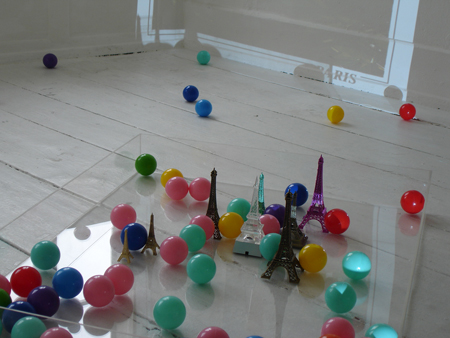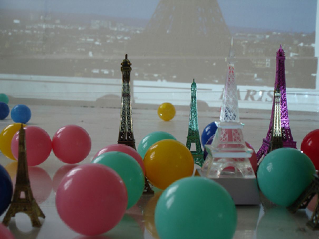 «Paris je t’aime» Spiel mit Plastikbällen, Eiffelturm-Nippes vom Strassenmarkt, Glaskasten, Fotorojektionen