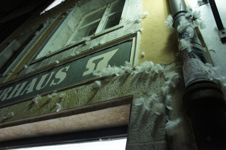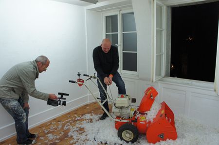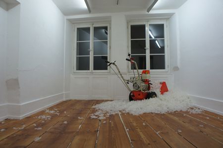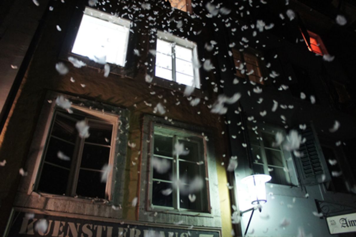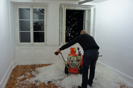 Im 2. Obergeschoss des Künstlerhauses steht während der gesamten Ausstellungsdauer eine Schneefräse samt einem grossen Haufen weisser Bettfedern (Daunen). Die Maschine steht direkt am Fenster zur Schmiedegasse. Zur bestimmten Zeit „fräst“ die Maschine die ganzen Bettfedern durch das offene Fenster auf die Gasse: „Dann schneit es in der Welt“ – oder es regnet Gold, Geld oder Boni.