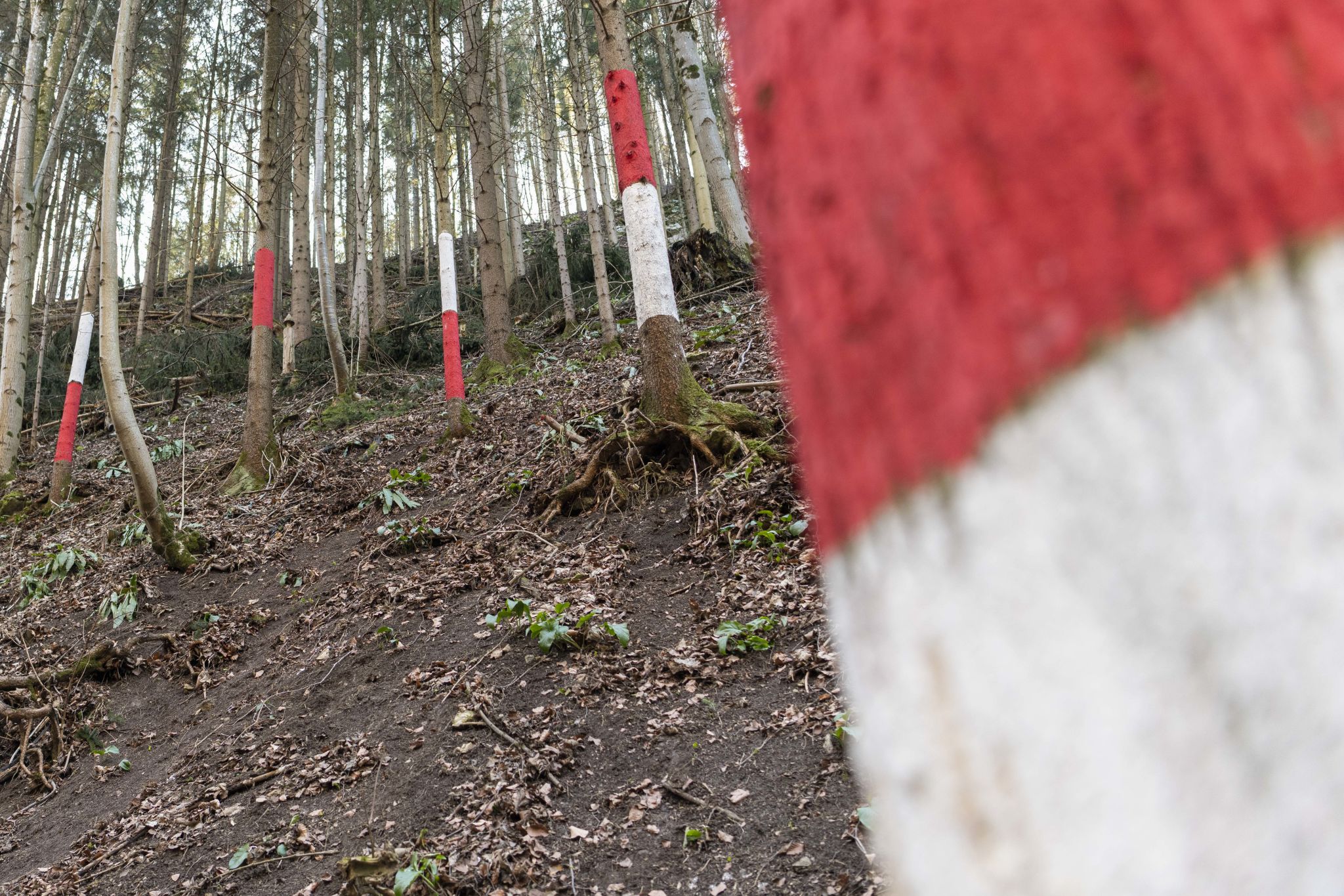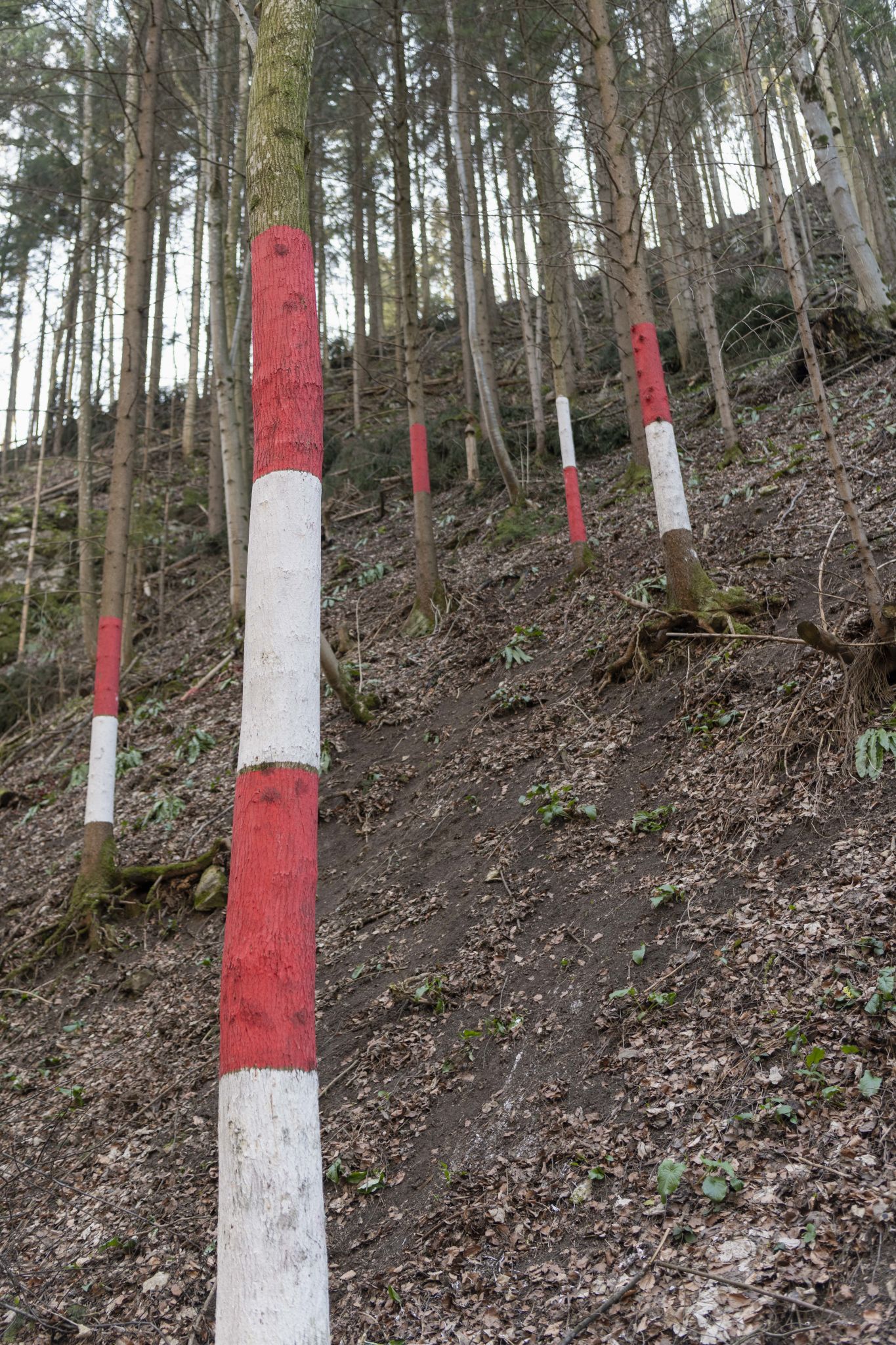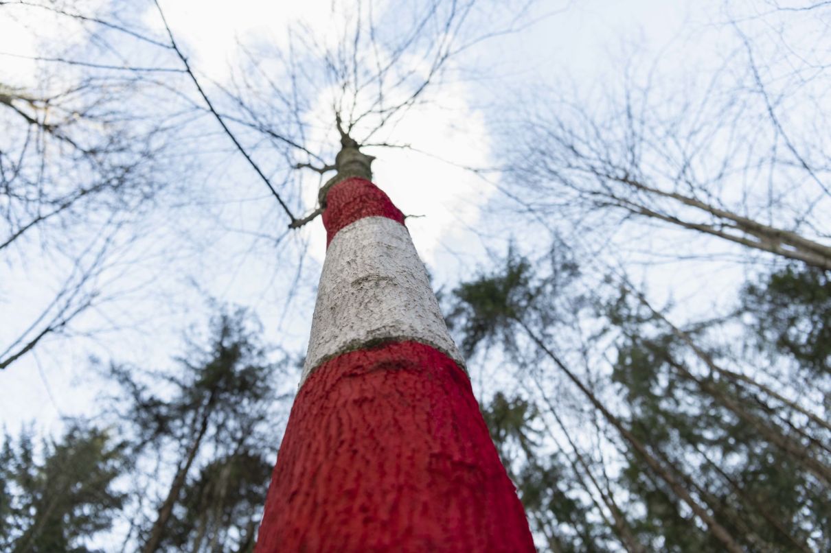 Die am Wegrand mit roter und weißer Farbe markierten Bäume symbolisieren Schlagbäume an einer imaginären Grenze. Der Schlagbaum (Schranke, Barriere) ist eine bauliche Vorrichtungen zum Sperren eines Weges- oder Grenze. Liegt der Schlagbaum über dem Weg, ist die Grenze zu. Steht er, ist sie offen.