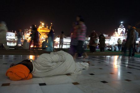 Im Goldenen Tempel ‚Hari Mandir‘ verbrachte ich einen Tag und eine Nacht. Dabei nutzte ich die Gelegenheit mich mit den Pilgern und Besuchern auszutauschen, mit ihnen zu essen und zu ruhen. Die Aufnahmen mit dem in weiss gekleideten Wallfahrer & orangefarbenen Turban ist am späten Abend während und nach dem Essen entstanden.