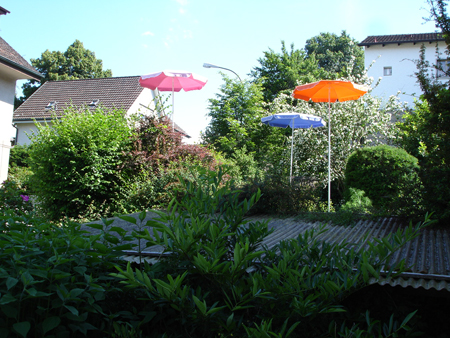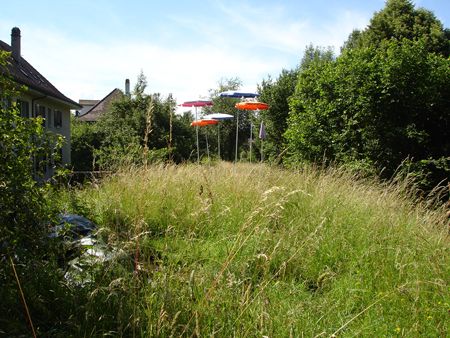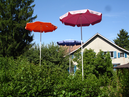 Die Sonnenschirm Objekte stehen in verschiedenen privaten Gärten von Wabern (BE). Einen ganzen Sommer lang, fest verankert im Freien. Der Sonne, aber auch Wind und Wetter ausgesetzt.