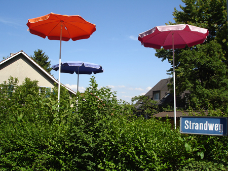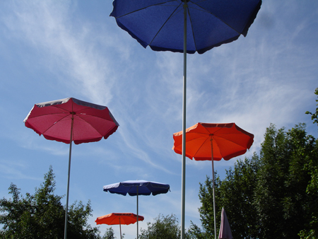 Die Schirme sind auf fünf Meter hohe Metallrohre aufgesetzt. Überhöht. Was deren Funktion (Schutzschirm) wohl widerspricht.